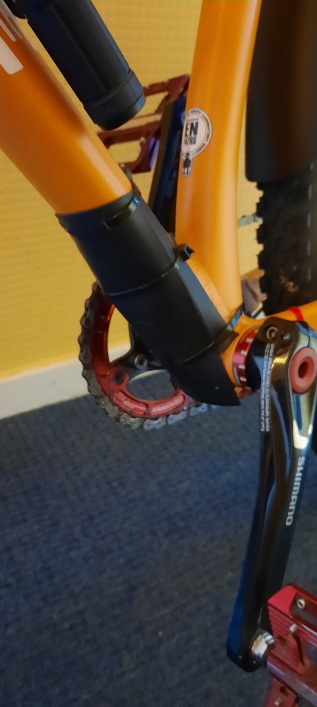 The internally routed cables on my Scandal come out of the frame, round the bottom bracket and back into the frame. It looked to me that this was going to gather mud, so I’ve come up with a home-made cover, fabricated from an old section of mudguard. Will see how it works.