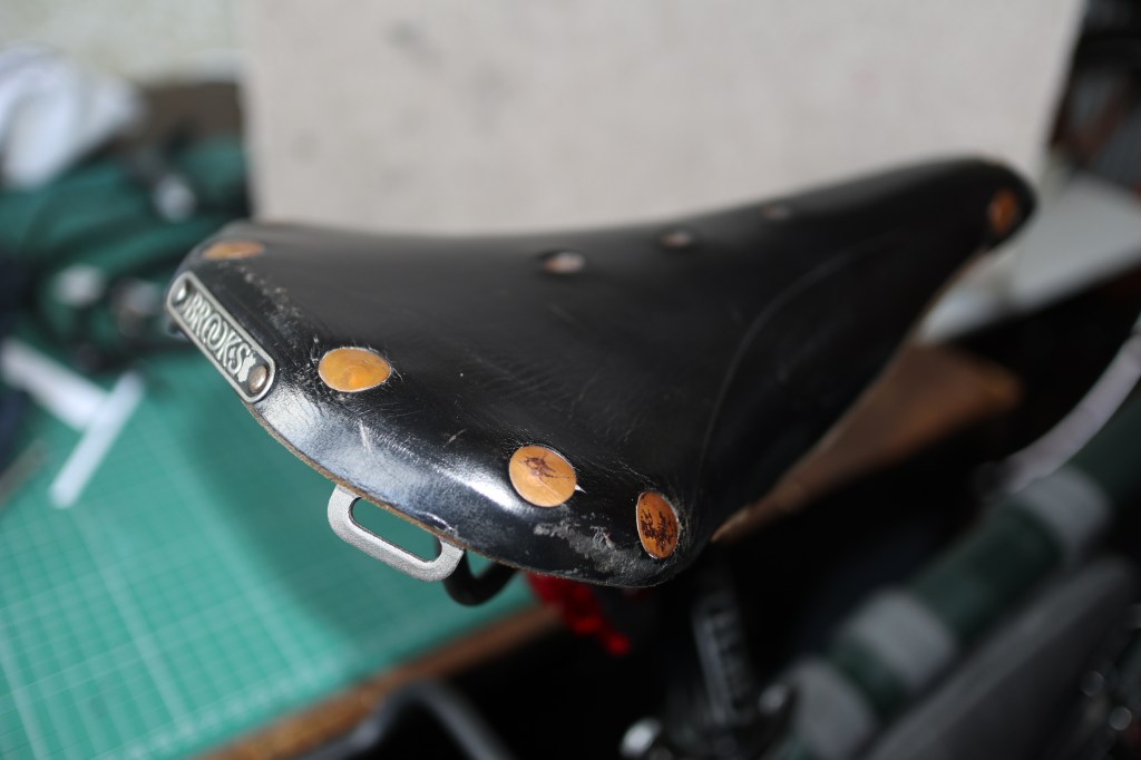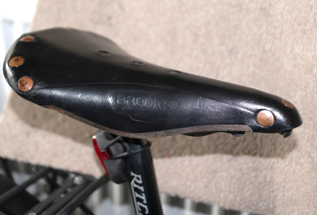 I’d had my brown, leather Brooks saddle for a few years and moved it from bike to bike. This was because these saddles are so comfortable. When I’m touring, I’ve found that this is the best for what can be hours at a time in the saddle. I often get comments that I’m using an “old fashioned” saddle but I’ve never found a plastic, padded saddle which can match it. Recently I found a black saddle with titanium rails and copper rivets on e-bay at a price I couldn’t really turn down and in great condition so, for purely aesthetical reasons, I bought it and sold the brown one. The new (to me) saddle took a few rides to shape but with use I’m sure it will become as comfortable as the one it replaced.