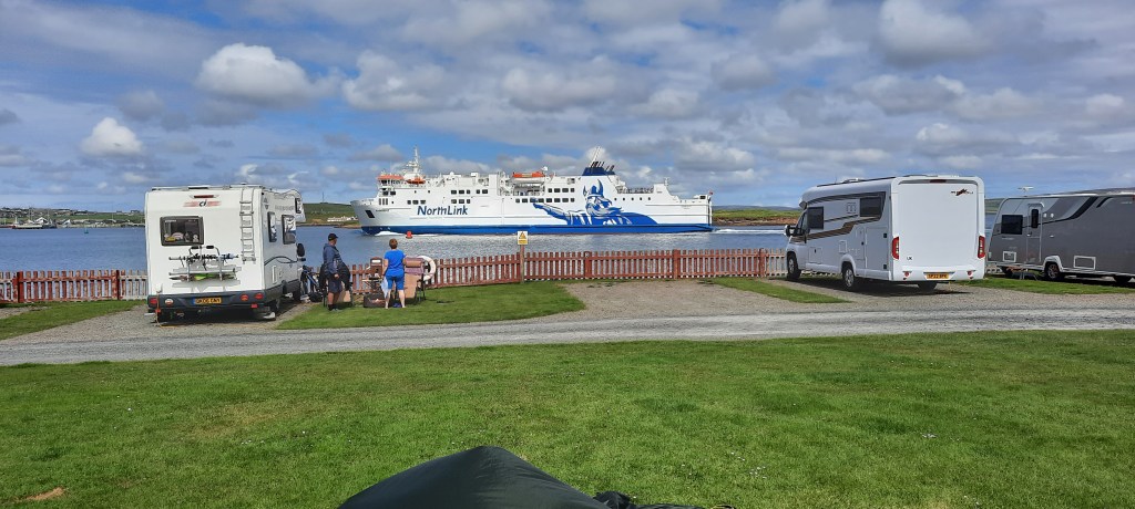 My journey to Orkney from Lerwick in Shetland began with a late afternoon ferry trip. I had phoned ahead and made sure that I would be OK to arrive at the campsite in Kirkwall after 11.00pm. They seem to be used to the request and as I had paid in advance, I was given directions to my pitch. The light was just beginning to go when I cycled the mile or so from the terminal to the campsite and I got my tent pitched before it got too dim. (it doesn’t really get dark at this time of year)