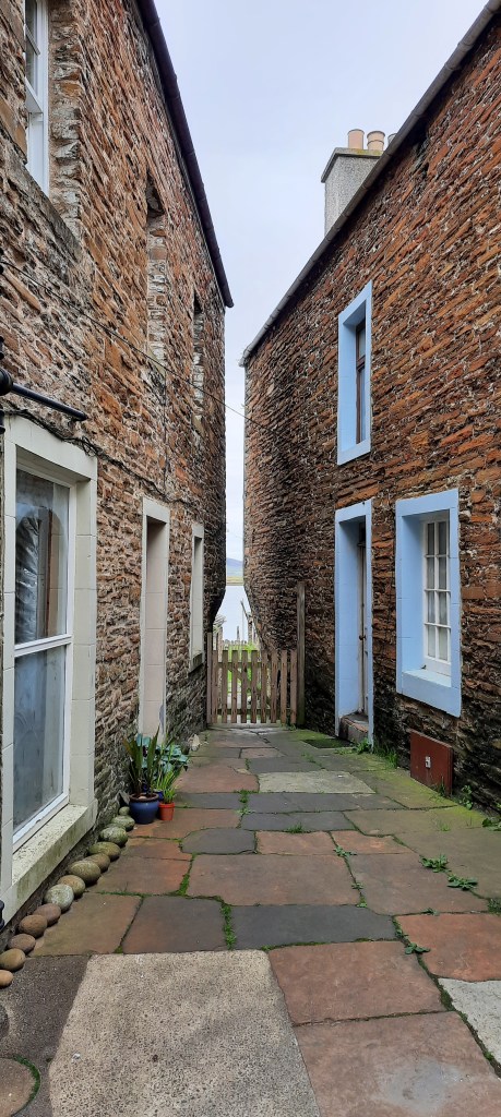 Point of Ness campsite is situated about half a mile out of the town. It is reached by the main street through the older part of the town which winds its way between the old houses some built right on the shoreline, with narrow lanes angling off inland. It has a feeling of a pedestrian precinct, so care has to be taken to avoid traffic. One caution about the campsite – the online booking system for Orkney Council can be confusing and I managed to book a pitch at the wrong campsite. I have written to complain so hopefully it will be sorted. As with the site in Kirkwall it is run by Orkney Council and has everything you would need. It’s not quite so well equipped as the Kirkwall site but with that one being bigger and in the capital it’s understandable.